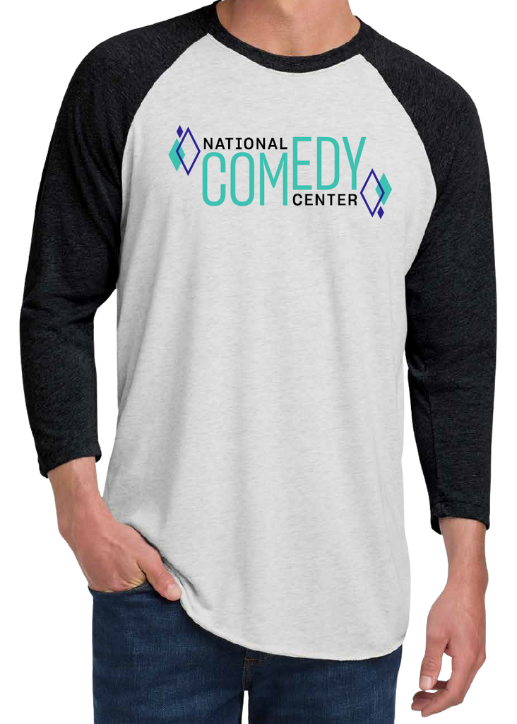 This 3/4 sleeve baseball tee features the National Comedy Center logo on the front.